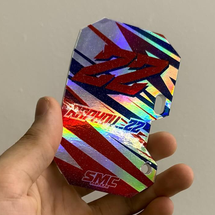 Pour l'utilisation d'une matière FULL HOLO ou FULL CHROME le blanc présent sur la maquette envoyée par e-mail deviendra HOLO ou CHROME (plutot dans les tons gris)